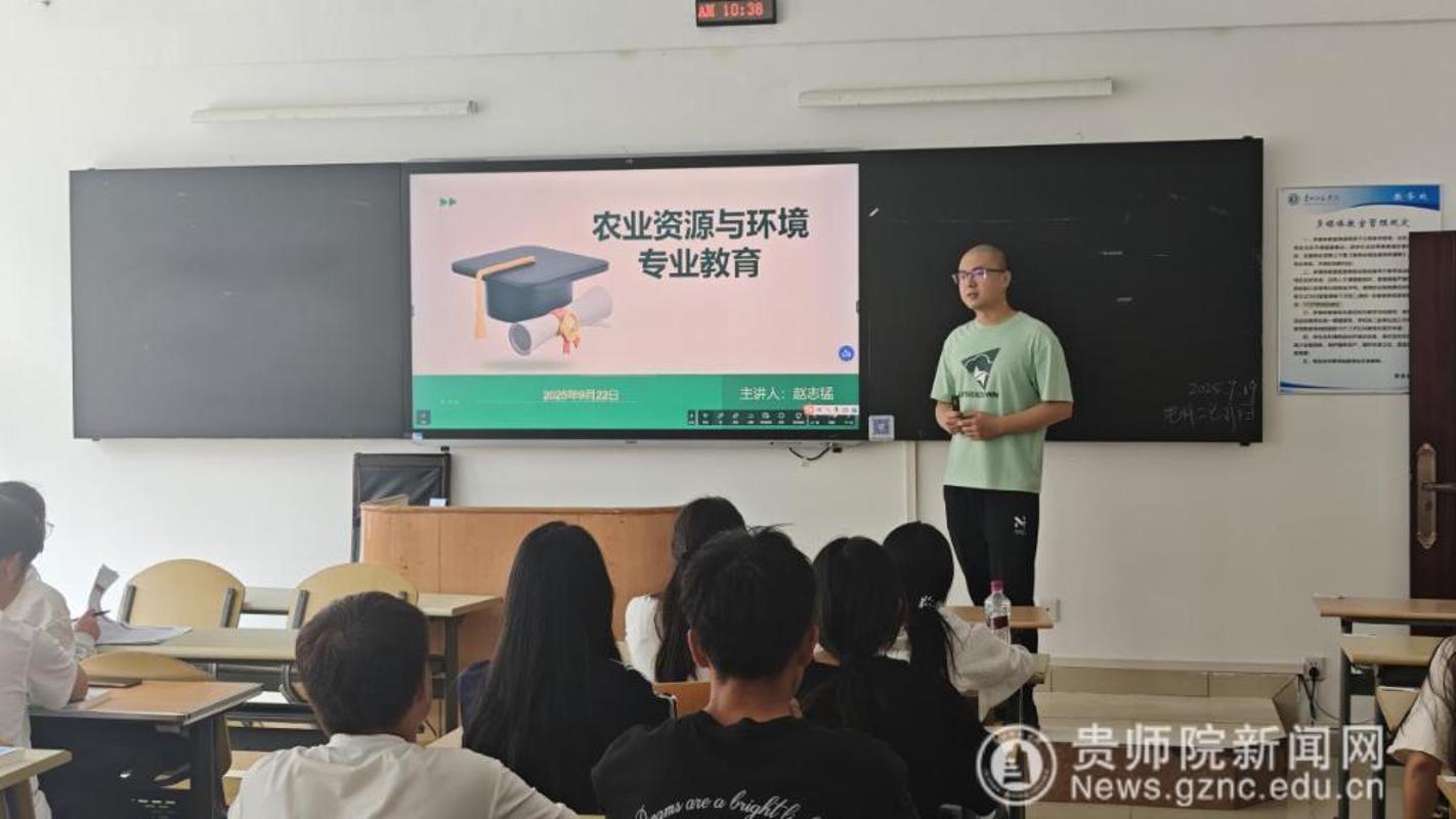 讲座会上,赵志猛重点解读了《农业资源与环境专业人才培养方案》及《贵州师范学院普通本科学生学士学位授予工作实施办法(贵师院发〔2025〕41号)》,详细说明培养目标、核心课程、毕业要求及学位授予条件,并特别强调“三不原则”——不旷课、不作弊、不过度依赖AI,明确学业底线。关于学业规划,引用“预则立,不预则废”的古语,提醒新生制定合理目标与学习计划的重要性,同时介绍了“本科生导师制”“一课多师”等创新培养模式。讲座最后寄语同学们:“四年后,希望大家既有家国情怀与职业信仰,也能用专业技术解决农业资源开发与环境保护的实际问题。”