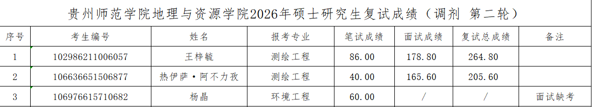 贵州师范学院地理与资源学院2026年硕士研究生复试成绩(调剂 第二轮)