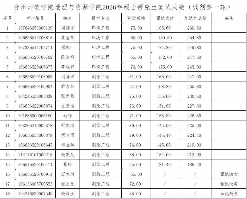 贵州师范学院地理与资源学院2026年硕士研究生复试成绩(调剂第一轮)